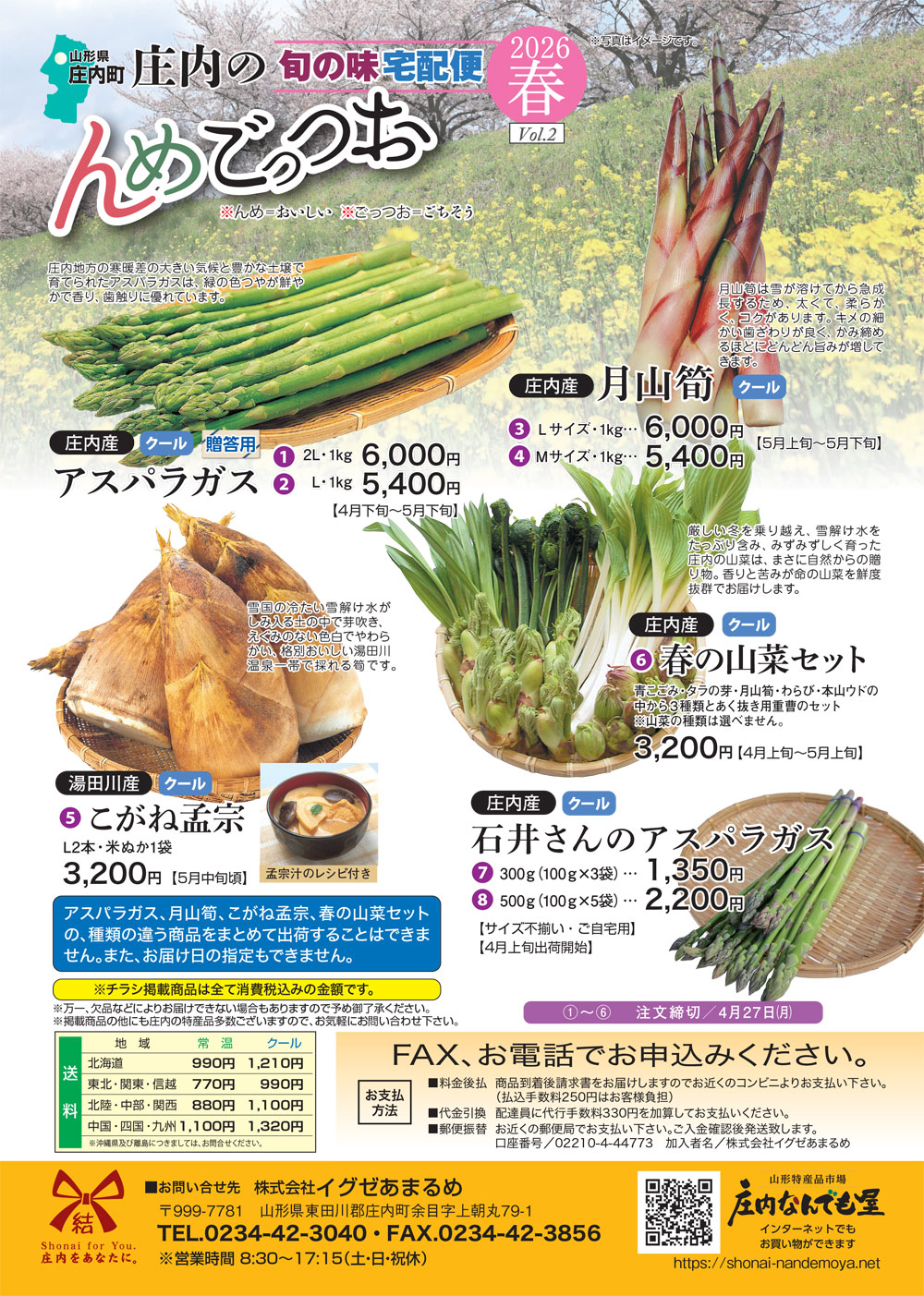 庄内なんでも屋担当者が厳選した旬の「庄内の春の味覚」をお届け! 「んめごっつぉ」とは庄内弁で「美味しいご馳走」という意味で、ここではその季節・時期ごとに庄内の旬の味覚をお届けいたします。 庄内の味覚の中から春におすすめの商品を厳選してお届け。 商品画像をクリックするとそれぞれの詳細画面へと進みます。